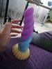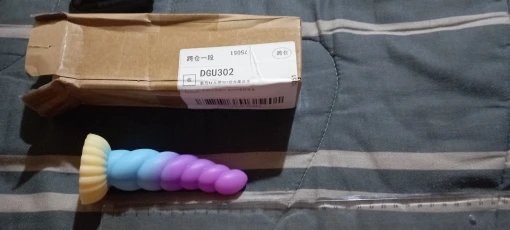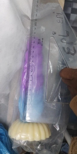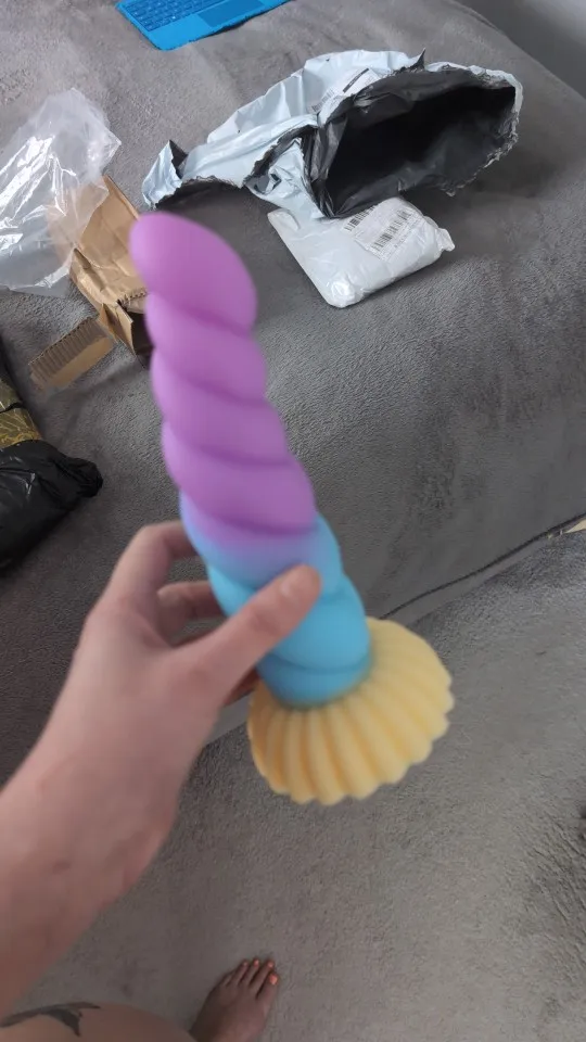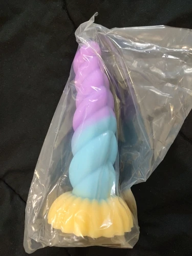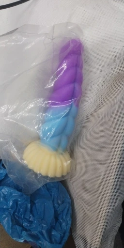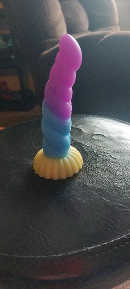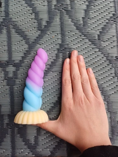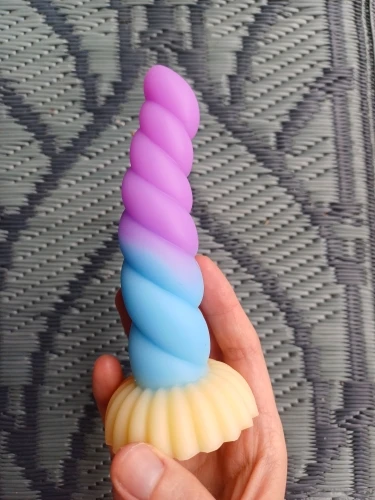 Really pretty toy! It's made from very soft, squishy, milky silicone, the detail is nice, it has a decently strong suction cup on the bottom, and feels really pleasant, both to touch and in use. I love the colors and the curvature, and the ribbed, sort of half-swirled design makes for a really pleasurable experience in use. I took the smallest one, and i honestly thought it's gonna be a little smaller, but it's just perfect for me! Though i generally tend to like smaller toys due to my atypical anatomy, so if you feel like 13cm of length is not quite enough, then you should probably aim for medium or large size for this toy.