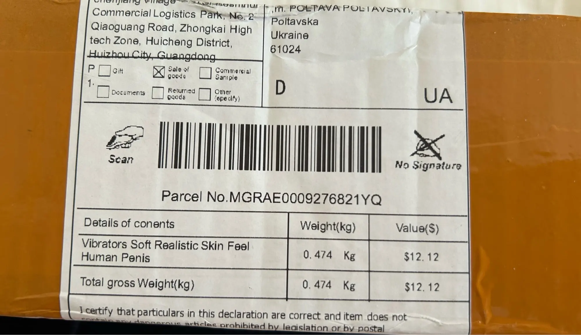 The product is good. The delivery is fast. But please note that the box says that the inside is Human penis